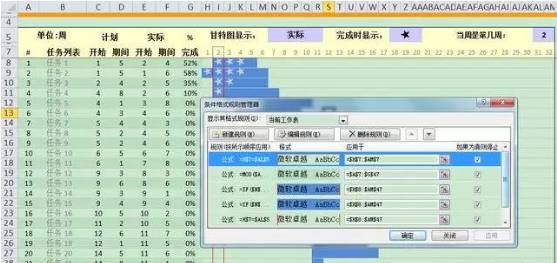 =IF($N$5=INDEX(ganttTypes,1),AND(H$7>=$C8,H$7<$C8+$D8,H$7=$AL$5),AND(H$7>=$E8,H$7<$E8+$F8,H$7=$AL$5)) 注:設置計劃的甘特圖