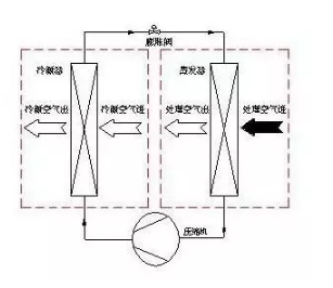 當室內溫濕度都比較高,而且室內冷負荷比較大時,系統運行于降溫除濕模式。此時四通閥不帶電,系統按制冷方式運行,室內第二換熱器支路為電磁閥關斷,室外換熱器為冷凝器,室內第一換熱器為蒸發器。室內空氣只被室內第一換熱器降溫除濕,成為低溫低濕的空氣返回室內。在這種模式下,還可以調節室外換熱器的風量或水量進一步調節制冷量和除濕量,制冷量和除濕量都隨著室外換熱器風量或水量的增加而上升,