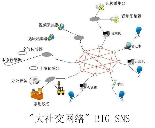 一直以來,社交網絡被認為就是互聯網上人與人的交互社區。但隨著物聯網,云計算,大數據等新現象的出現,社交網絡的形態也必將發生改變。當物聯網,工業4.0,工業互聯網與社交網絡融合時,每一棟大樓,每一輛汽車,每一個景區,每一個商場,每一個電器都會在SNS網站上開設賬號,自動的發布自己實時的信息,并與其他”人“,和“物”進行交互.社交網絡的定義將不再僅僅是人與人的社交,而是人與人,人與物,物與物的范圍更大的社交網絡.我們可以稱為“大社交網絡”(Big SNS))。