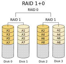 raid10:就是raid1+raid0,比較適合速度要求高,又要完全容錯,當然¥也很多。最少需要4塊硬盤(注意:做raid10時要先作RAID1,再把數個RAID1做成RAID0,這樣比先做raid0,再做raid1有更高的可靠性)。