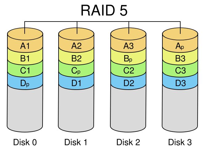 RAID 3:為了說明白RAID 5,先說RAID 3,RAID 3是若你有n塊盤,其中1塊盤作為校驗盤,剩余n-1塊盤相當于作RAID 0同時讀寫,當其中一塊盤壞掉時,可以通過校驗碼還原出壞掉盤的原始數據。這個校驗方式比較特別,奇偶檢驗,1 XOR 0 XOR 1=0,0 XOR 1 XOR 0=1,最后的數據時校驗數據,當中間缺了一個數據時,可以通過其他盤的數據和校驗數據推算出來。但是這有個問題,由于n-1塊盤做了RAID 0,每一次讀寫都要牽動所有盤來為它服務,而且萬一校驗盤壞掉就完蛋了。最多允許壞一塊盤。n最少為3。