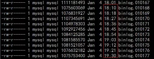 轉換后,發現主從延遲逐漸增大,基本每天落后主機大概50個binlog左右,大概延遲7.5個小時左右的數據,主機每天大概產生160個binlog,binlog列表如下圖所示: