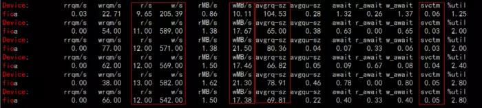 從IO情況看也沒什么問題,單個IO延遲很小,IOPS很低,寫帶寬也不大。調度規則(cat /sys/block/fioa/queue/scheduler)和塊大小等和主機設置是一樣的,排除掉磁盤的問題。