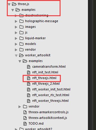 我們將生成的NTF文件拷入到AR.js-master項目中data/dataNTF中,我這里新建了一個目錄叫dayan的文件夾,并將文件粘貼進去,標識生成以后需要做測試了,怎么測試呢,找到如圖的nft_threejs.html,這是官方用來測試自然圖片的demo.