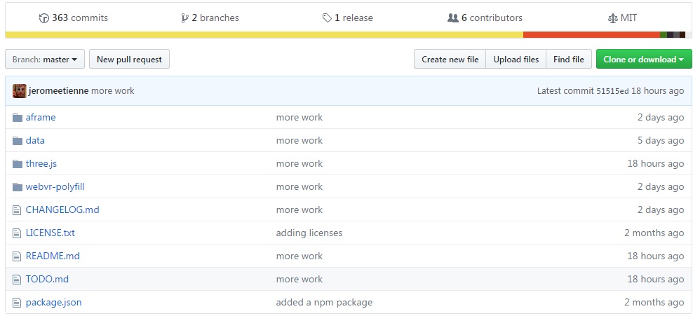 咱們的例子主要在這個開源庫上更改,它的一級目錄,aframe data three.js webvr-polyfill,一看就很清晰了,今天咱們單刀直入,只看three.js部分,當然也要依賴于data目錄里的數據。