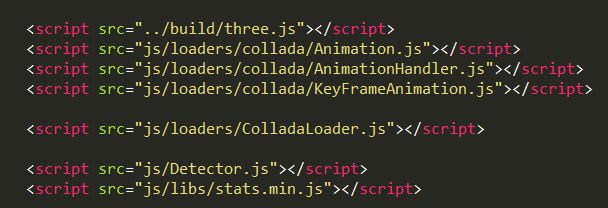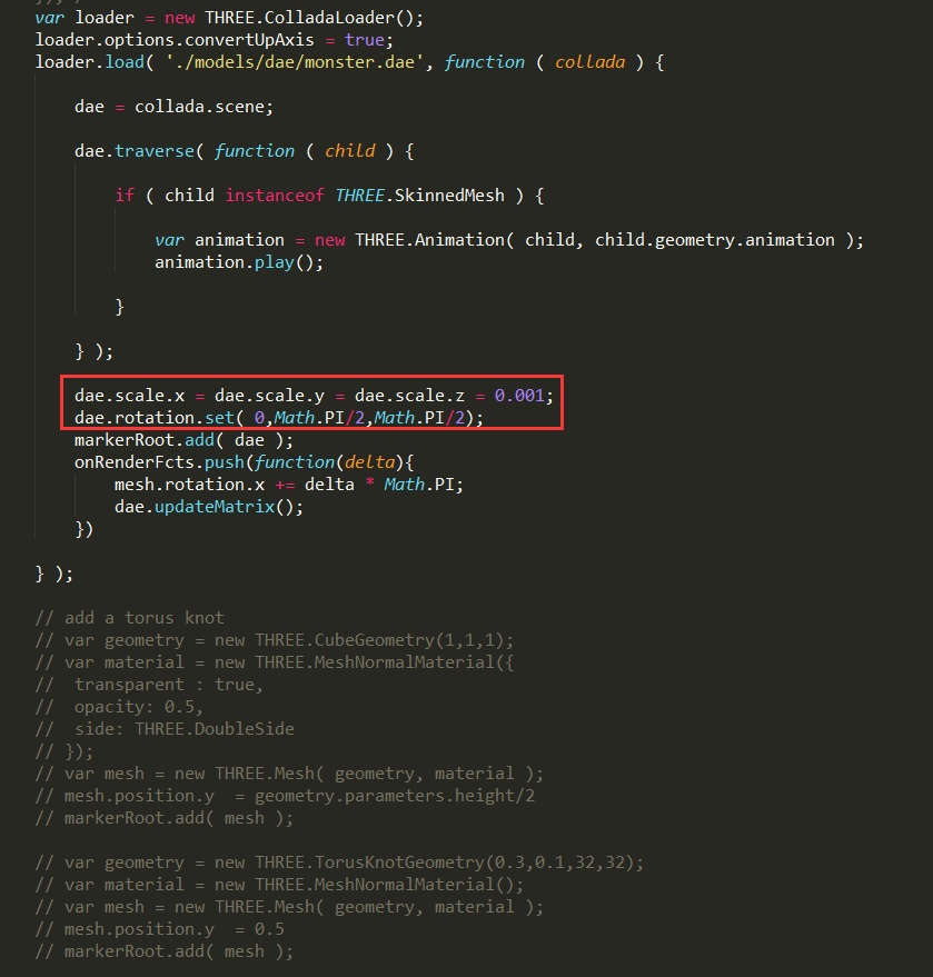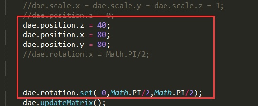 我注釋掉的部分是官方的模型運行的代碼。上面部分則是three.js中的源碼,我這是在紅框的地方更改一下模型的定位。我這個模型大家可以直接參考three.js源碼中three.js-r82\examples\webgl_loader_collada.html 這個html文件,可以直接運行的例子,將如下代碼替換掉dev.html中我注釋的部分即可,具體請參考截圖,并不是完全替換。