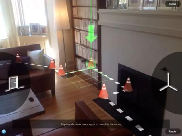 你只要在房內拍攝一圈,它自動會為你生成房間布局的平面圖。Magicplan的使用方法很簡單。站在房間的中間位置,然后拿著iPhone/iPad對著房間四角按順序拍攝下來即可,之后自動會合成房間的平面布局圖。