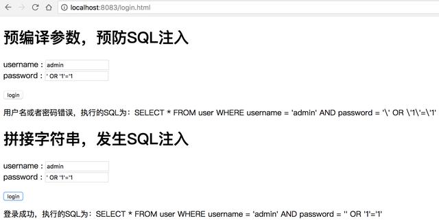 這是最常見的 SQL注入攻擊,當我們輸如用戶名 admin ,然后密碼輸如' OR '1'=1='1的時候,我們在查詢用戶名和密碼是否正確的時候,本來要執行的是SELECT * FROM user WHERE username='' and password='',經過參數拼接后,會執行 SQL語句 SELECT * FROM user WHERE username='' and password='' OR '1'='1',這個時候1=1是成立,自然就跳過驗證了。