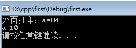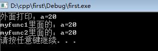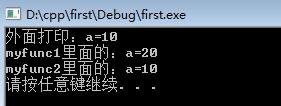 #include<iostream>#include<string>using namespace std;const int a = 10;void myfunc1() {const int a = 20;printf("myfunc1里面的:a=%d ", a);}void myfunc2() {printf("myfunc2里面的:a=%d ", a);}int main() {printf("外面打印:a=%d ", a);myfunc1();myfunc2();system("pause");return 0;}