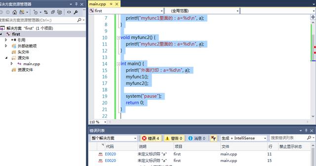 #include<iostream>#include<string>using namespace std;void myfunc1() {const int a = 20;printf("myfunc1里面的:a=%d ", a);}void myfunc2() {printf("myfunc2里面的:a=%d ", a);}int main() {printf("外面打印:a=%d ", a);myfunc1();myfunc2();system("pause");return 0;}