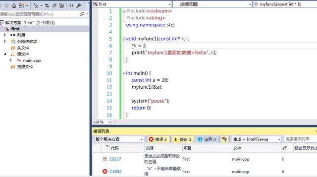#include<iostream>#include<string>using namespace std;void myfunc1(const int* k) {*k = 3;printf("myfunc1里面的數據=%d ", k);}int main() {const int a = 20;myfunc1(&a);system("pause");return 0;}