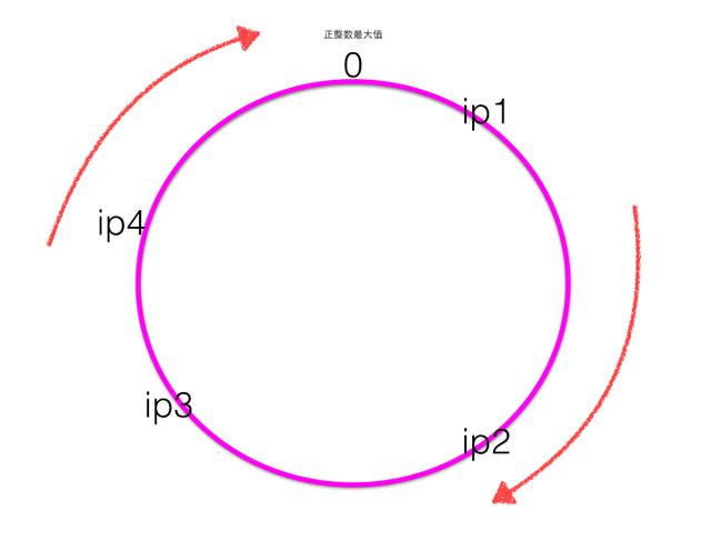 hash環上順時針從整數0開始,一直到最大正整數,我們根據四個ip計算的hash值肯定會落到這個hash環上的某一個點,至此我們把服務器的四個ip映射到了一致性hash環