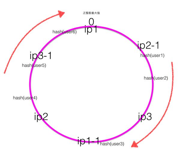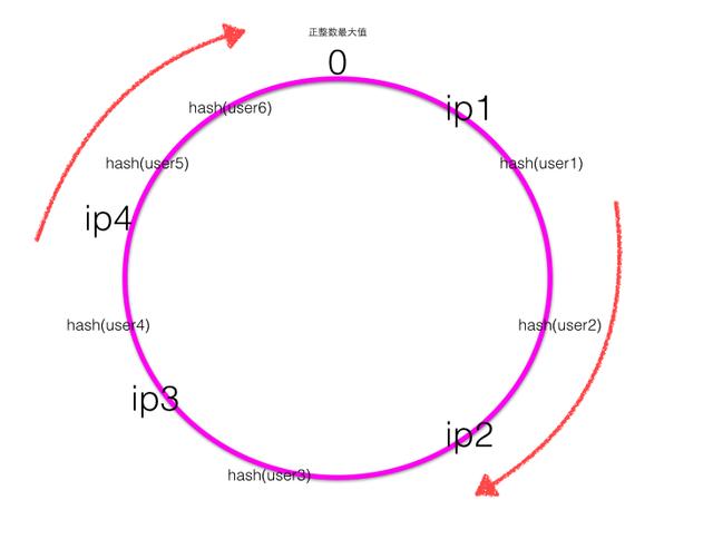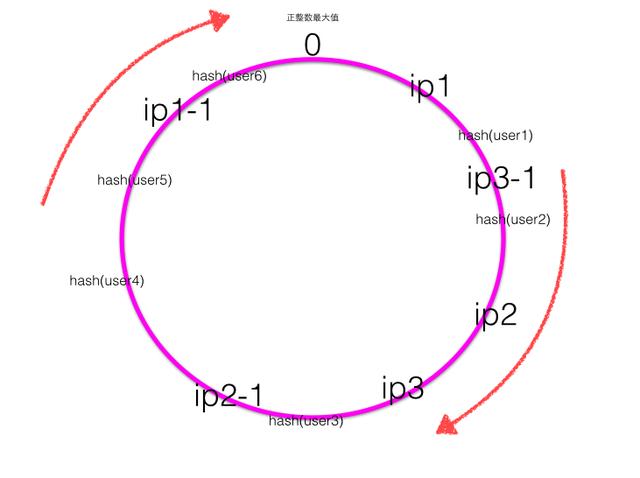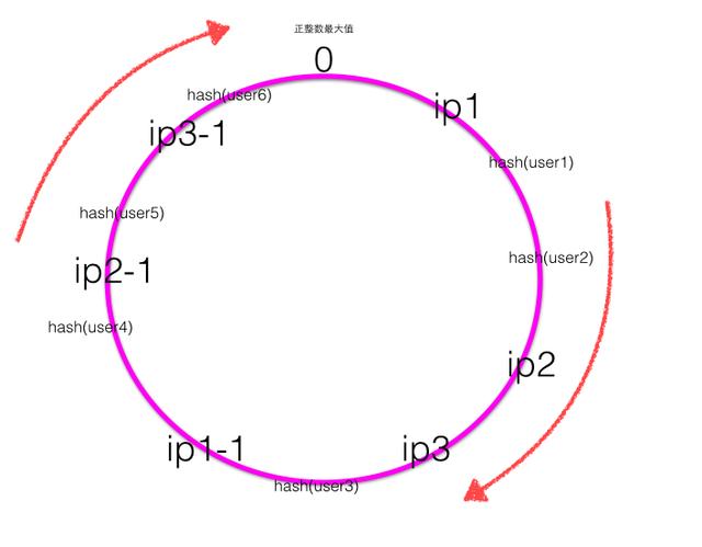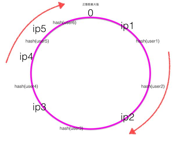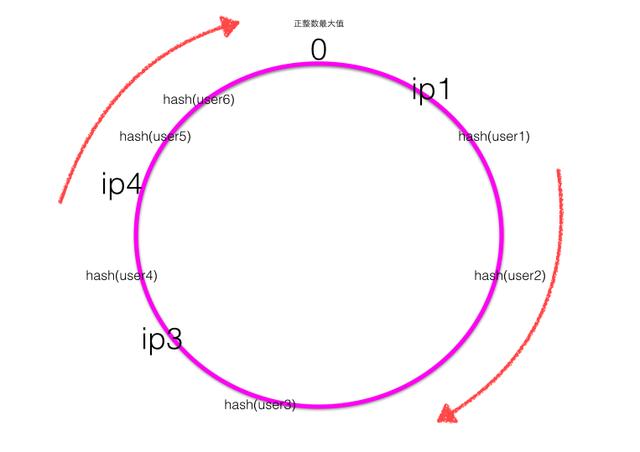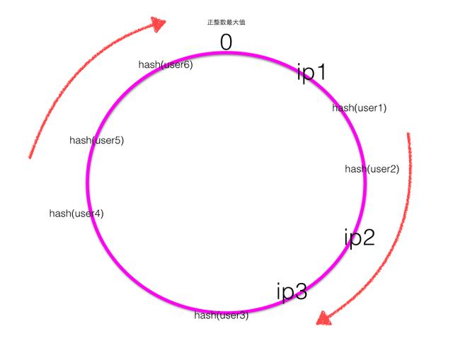 當用戶在客戶端進行請求時候,首先根據hash(用戶id)計算路由規則(hash值),然后看hash值落到了hash環的那個地方,根據hash值在hash環上的位置順時針找距離最近的ip作為路由ip.