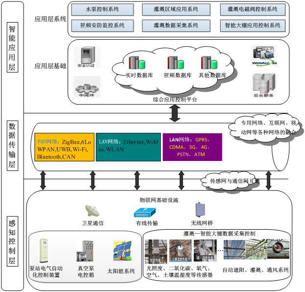 智能節(jié)水灌溉系統(tǒng)采用物聯(lián)網(wǎng)的三層架構(gòu),分為感知控制層、數(shù)據(jù)傳輸層、智能應(yīng)用層,并結(jié)合視頻監(jiān)控系統(tǒng)對農(nóng)作物生長情況的遠(yuǎn)程監(jiān)視,實時對分灌區(qū)環(huán)境參數(shù)的檢測和環(huán)境調(diào)整機構(gòu)的控制。