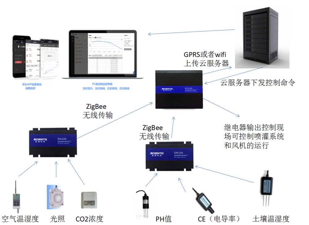 基質(zhì)墑情(PH值、電導率、溫濕度)、作物生長環(huán)境(空氣溫濕度、光照強度、CO2濃度)等采用4-20mA輸出信號傳感器,將檢測到的數(shù)據(jù)直連傳輸給DZ100-Z,ZigBee數(shù)據(jù)采集模塊,DZ100-Z將采集到的數(shù)據(jù)通過ZigBee無線的形式傳輸給DN100監(jiān)控主機,DN100主機將數(shù)據(jù)進行分析處理、記錄存儲,并通過DN100主機內(nèi)部的繼電器輸出來控制現(xiàn)場的風機的運轉(zhuǎn)和噴灌系統(tǒng)的啟停。