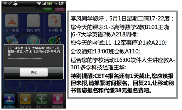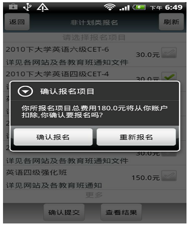 如:教務處用WEB報名通知子系統發送報名通知到每個尚未通過計算機等級考試的學生,學生看到報名短信后用手機報名扣費,經過選擇項目及確認,完成報名。