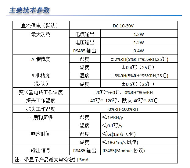 本溫濕度變送器采用銅顆粒燒結溫濕度傳感器護套,溫濕度傳感器與殼體直接相連外觀美觀大方。輸出信號為RS485輸出。