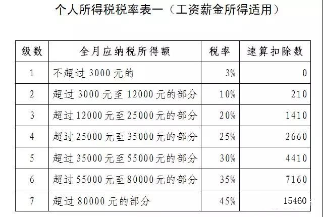 其中:基本減除費用為5000元/月,“通知”規定的“工薪所得”稅率表如下: