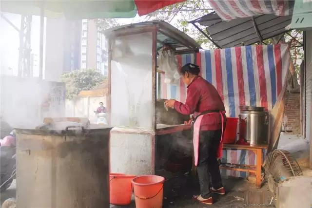 酒廠門口的窩仔粉攤檔可以說是簡陋,用紅白藍布搭起的“棚”、露出紅銹的流動檔攤和固定老舊筒形爐灶的竹筒都散發出濃重的年代感和樸實感,你看,整個店面是這樣的↓
