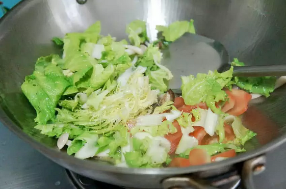 煮番茄面要先把番茄燙過,然后把皮剝了,甚至蕃茄子也掏出來,剁得很碎,之后放進(jìn)油里熬爛,熬得如同番茄醬一樣,再加入一點醬油,接著放水,再下面條。