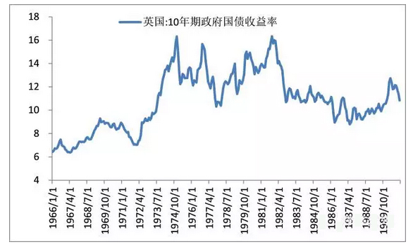 1979年撒切爾夫人上臺(tái)后,開始供給側(cè)改革,減少國(guó)企補(bǔ)貼,消減福利,財(cái)政風(fēng)險(xiǎn)下降,控制貨幣供應(yīng)量,收縮無(wú)效融資需求,英國(guó)央行的基準(zhǔn)利率和資本市場(chǎng)的無(wú)風(fēng)險(xiǎn)利率得以穩(wěn)定的下降,基準(zhǔn)利率從1979年的17%下降到1984年3月的8.75%。經(jīng)濟(jì)增速?gòu)?span lang="EN-US">1982年的-2.2%一路回升至1988年的5.9%,而通脹卻從1980年的18%迅速回落至1986年的3.4%。