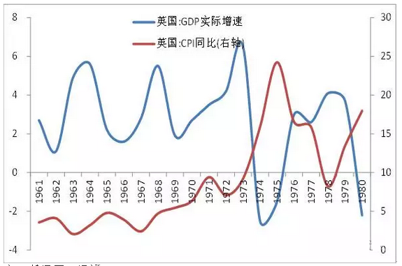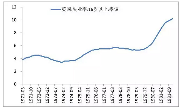 1973年第一次石油危機(jī)爆發(fā),布雷頓森林體系瓦解,全球經(jīng)濟(jì)陷入衰退,導(dǎo)致英國(guó)低增長(zhǎng)、高失業(yè)、高通脹、國(guó)際收支惡化等經(jīng)濟(jì)矛盾激化。面對(duì)危機(jī),英國(guó)工黨政府依然采取凱恩斯主義的宏觀調(diào)控政策,試圖通過(guò)逆周期的財(cái)政和貨幣政策刺激需求來(lái)降低失業(yè)率,推動(dòng)經(jīng)濟(jì)復(fù)蘇。但是英國(guó)經(jīng)濟(jì)面臨的是供給側(cè)的結(jié)構(gòu)性問(wèn)題,需求側(cè)的刺激不但沒有改善經(jīng)濟(jì),反而造成英國(guó)長(zhǎng)期持續(xù)的經(jīng)濟(jì)滯漲。