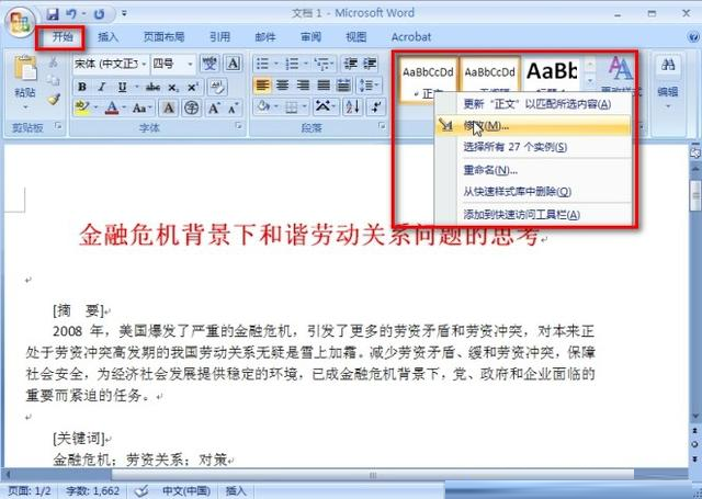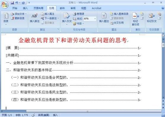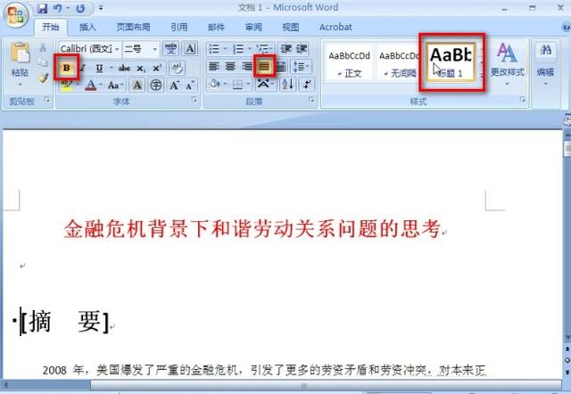 1、在[開始]--[樣式]中,主要就是用到標題1,標題2,標題3。把標題1,標題2,標題3分別應用到文中各個章節的標題上。例如:文中的“摘要”我們就需要用標題1定義。而“(一)和諧勞動關系應當是合同型的。”就用標題2定義。如果有1.1.1×××那就用標題3來定義。