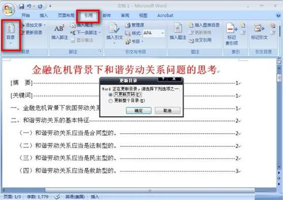 6、當你重新修改文章內容后,你需要更新一下目錄,方法是:[引用]--[目錄]--[更新目錄],在彈出的更新目錄窗口中選擇相應的選項點確定就可以了。