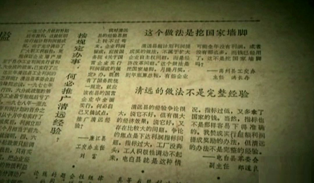 1980年8月1日,《人民日報(bào)》頭版頭條轉(zhuǎn)發(fā)了新華社的報(bào)道《實(shí)行超計(jì)劃利潤提成獎(jiǎng)和縣經(jīng)委直接管理工廠:清遠(yuǎn)縣經(jīng)濟(jì)體制改革形勢使人振奮———17個(gè)廠平均每月利潤增長36倍,廣東決定推廣“清遠(yuǎn)經(jīng)驗(yàn)”》,一石激起千層浪。