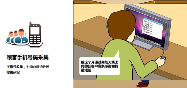 顧客通過輸入手機號碼,獲取驗證碼的方式上網(wǎng)。顧客實現(xiàn)自助上網(wǎng),商場收集號碼,作為日后定向營銷的對象。