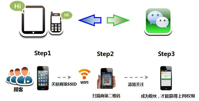 訪客進入商場接入無線網(wǎng)絡,被定向到指定提示頁面,提示顧客關注商場微信號然后即可獲取上網(wǎng)權限,顧客關注商場微信號即可上網(wǎng)。這樣便大大增加了商場的關注度,也便于廣告、業(yè)務推送和宣傳。