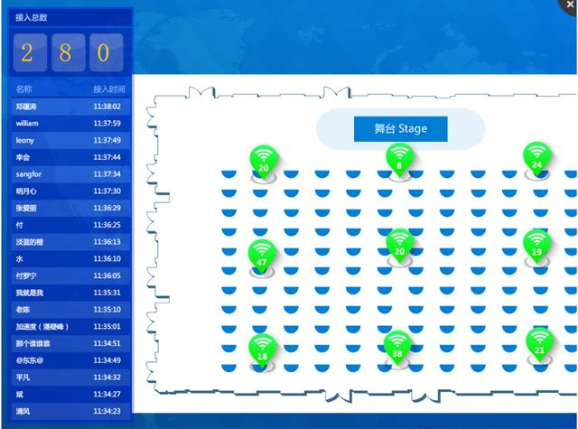 對于WLAN的運維, WLAN支持大屏幕顯示功能,能夠?qū)崟r的顯示每個接入點接入人數(shù)、實時在線用戶名等。如下圖: