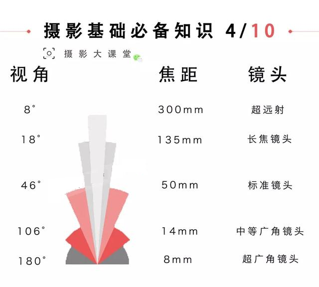 如下圖所示,不同焦距的鏡頭,可以被分為很多種。焦距用mm表示,當光圈大小不變時,焦距越大,視角越小,可拍攝范圍越小,但可拍攝的距離越遠。