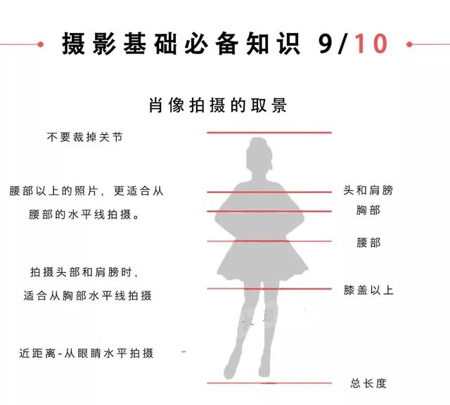 這取決于你想拍攝半身照,全身照,還是人物特寫。下圖介紹了每種拍攝的位置。在裁剪的時候,千萬不要裁掉人物的關節部分,否則圖片會看起來很糟糕。