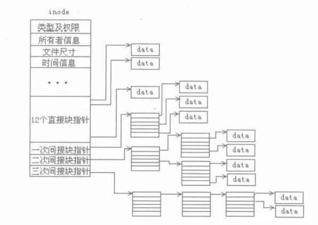 inode通過三級指針的方式來找到文件數(shù)據(jù)最終存儲的數(shù)據(jù)塊, 見下圖: