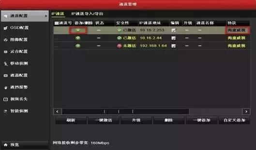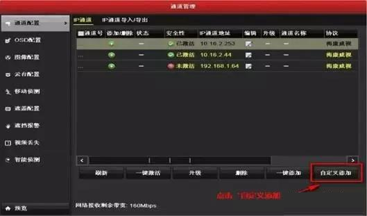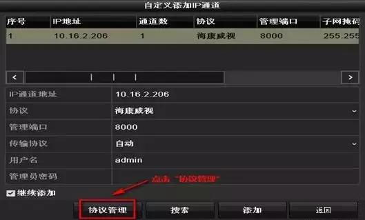 2.1 進入錄像機【主菜單】-【通道管理】-【通道配置】,點擊“自定義添加”,選擇協議管理,進入協議管理界面。