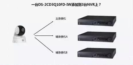 示例環境:如圖所示,需要將一臺DS-2CD3Q10FD-IW添加到3臺錄像機上,分別為主錄像機,輔錄像機A,輔錄像機B。