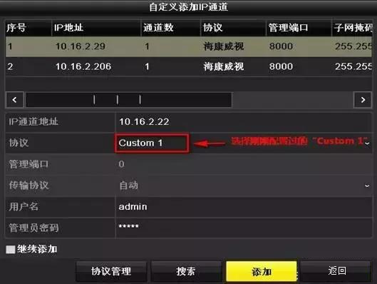2.3、點擊確定,進入【自定義添加IP通道】界面,選擇要添加的攝像機的IP,協議選擇步驟2.2中設置好的“Custom 1”,并輸入攝像機的用戶名與密碼,點擊“添加”。