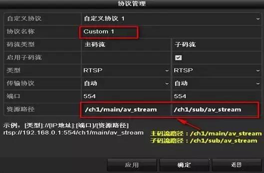 2.2 在【協議管理】菜單界面,“資源路徑”一欄輸入攝像機的主、子碼流的流地址。