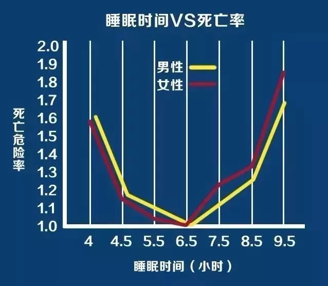 圖片顯示:成年人睡眠時間在6.5—7.4小時之間,死亡率最低,而少于4.5小時或高于9.4小時,死亡率明顯增高。