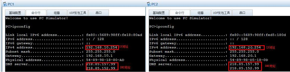 PC1與PC2成功DHCP到所在VLAN的IP和DNS地址