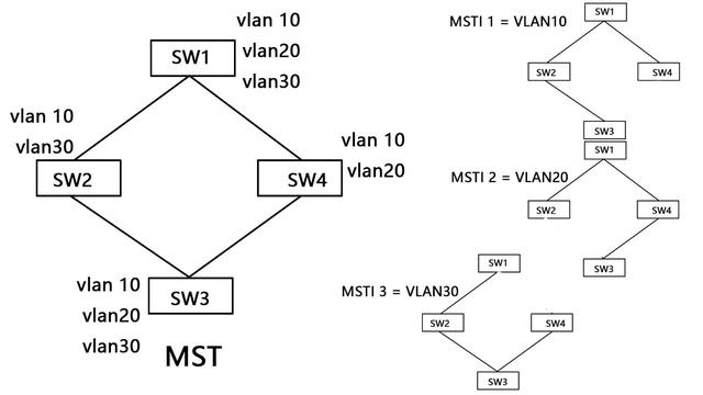 一個MSTP網絡中可以擁有多個MST,各個MST之間都存在物理連接(直接或者間接),管理員可以通過命令將交換機劃分到不同的MST當中。