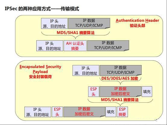 AH協議(Authentication Header,使用較少):可以同時提供數據完整性確認、數據來源確認、防重放等安全特性;AH常用摘要算法(單向Hash函數)MD5和SHA1實現該特性。