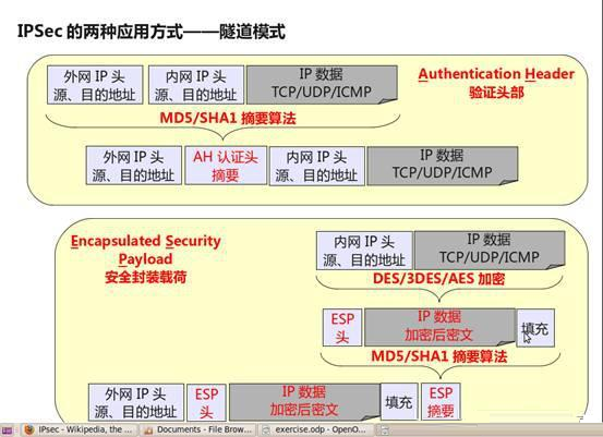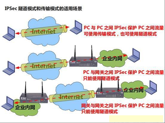 從上圖我們還可以驗證上一節所介紹AH和ESP的差別。下圖是對傳輸模式、隧道模式適用于何種場景的說明。