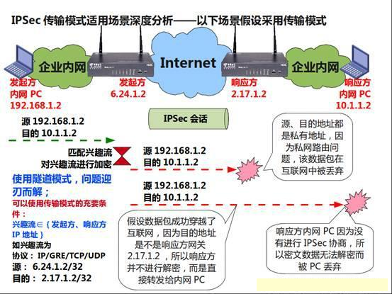 我們利用這個反證法,巧妙地解釋了在Site-to-Site情況下不能使用傳輸模式的原因。并且提出了使用傳輸模式的充要條件:興趣流必須完全在發起方、響應方IP地址范圍內的流量。比如在圖中,發起方IP地址為6.24.1.2,響應方IP地址為2.17.1.2,那么興趣流可以是源6.24.1.2/32、目的是2.17.1.2/32,協議可以是任意的,倘若數據包的源、目的IP地址稍有不同,對不起,請使用隧道模式。