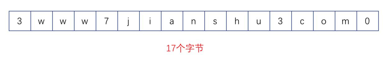 簡單解釋下域名長度為何是17個字節,以小數點為分隔單位,第1個3表示www占3個字節,第2個7表示jianshu占7個字節,第3個3表示com占3個字節,最后一個置0,表示后域名結束。