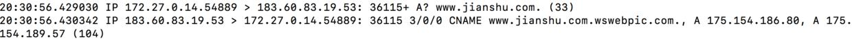此時A通過54889端口(臨時端口,使用UDP協議,如果你不清楚UDP協議是什么,請參考我的另一篇文檔TCP和UDP,你要知道的123 (UDP篇)),和B主機的53端口通信,第1條報文是A主機發向B主機,+號表示遞歸查詢,A表示查詢類型,意思是需要查詢IP地址,?表示這是一條查詢報文。www.jianshu.com表示要查詢的域名,33表示字節,UDP的首部長度是12個字節,域名長度為17個字節,查詢類型和類占4個字節。