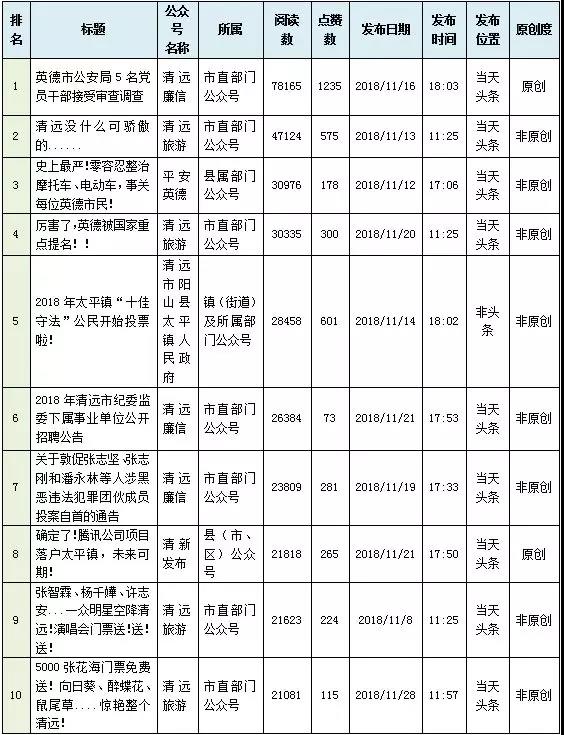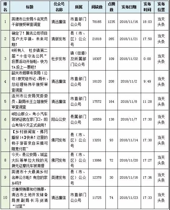 清遠發布與中山大學大數據傳播實驗室聯合發布的清遠政務微信影響力月度榜單(2018年11月)出爐啦!