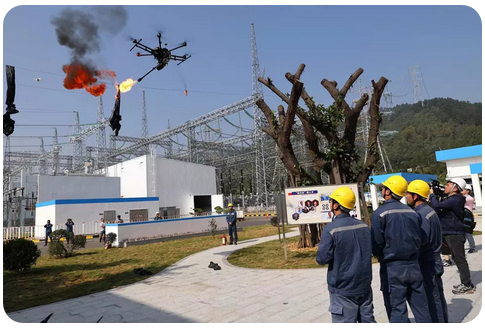 南方電網廣東江門供電局無人機團隊現場演示噴火無人機清障