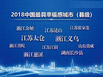 江蘇太倉、浙江余姚、浙江普陀、浙江慈溪、浙江義烏、江蘇昆山、江蘇江陰、湖南長沙縣、江蘇張家港、山東榮成十座縣級城市被推選為“2018中國最具幸福感城市(縣級)”。